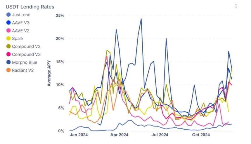 Notably, the demand surge for lending drove interest rates to exceptional levels, now exceeding 10% on average and reaching as high as 40% on certain platforms. Interestingly, these figures mirror the peak dynamics seen in the 2022 bull market.