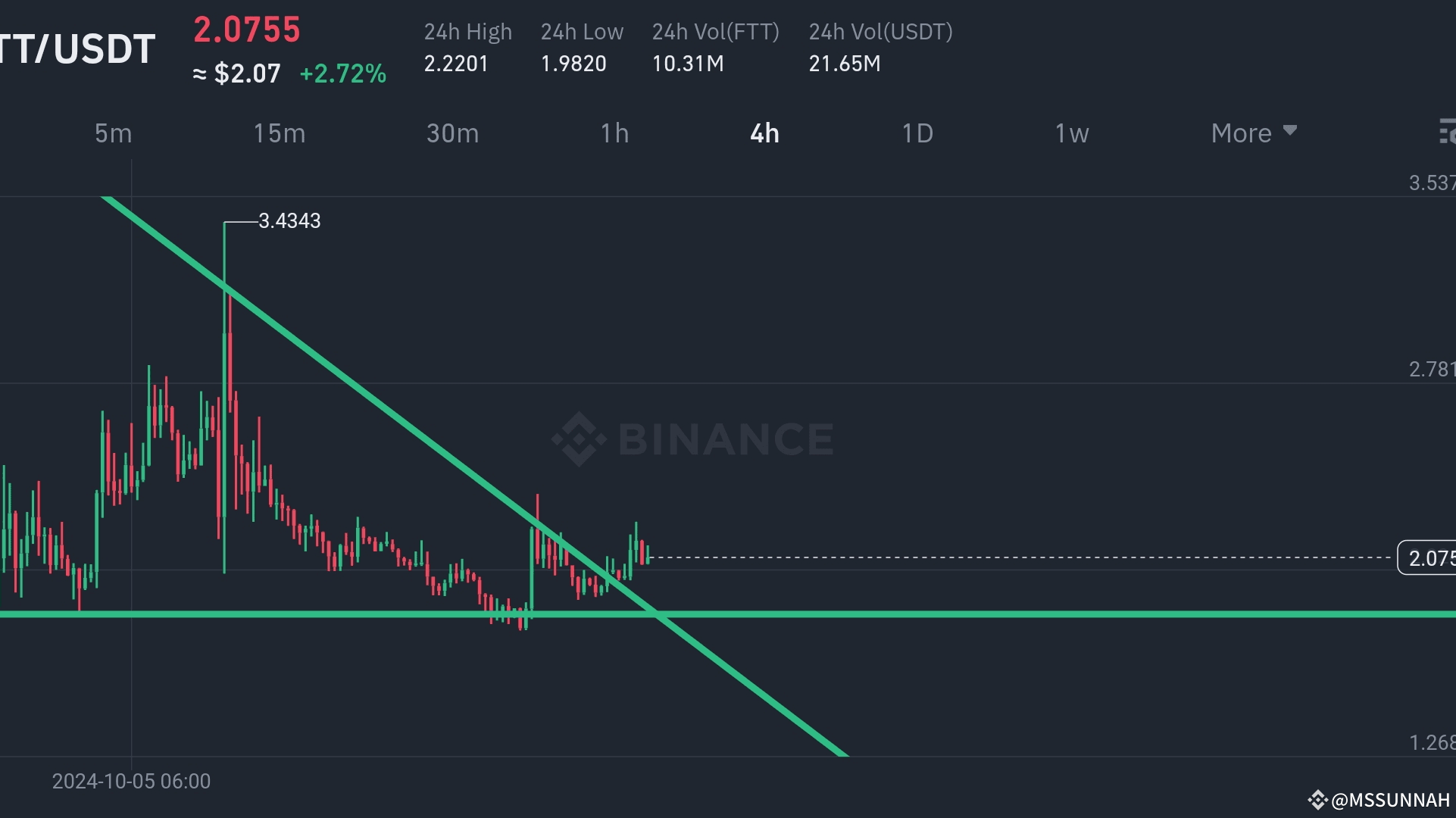 Prolomení sestupné trendové linie: FTT/USDT se prolomilo nad sestupnou trendovou linií, což je býčí signál. To naznačuje, že tlak na snižování cen může slábnout.