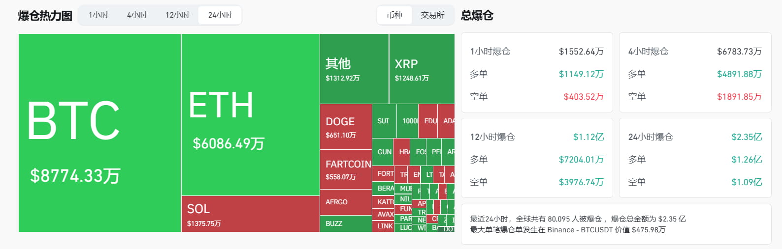 BTC liquidace dosáhla částky 8774,33 milionu dolarů, ETH liquidace 6086,49 milionu dolarů, XRP liquidace 1248,61 milionu dolarů. Během posledních 24 hodin bylo liquidováno celkem 80 095 lidí, největší jednotlivá liquidace se objevila na obchodním páru BTC-USDT na Binance, v hodnotě 475,98 milionu dolarů.