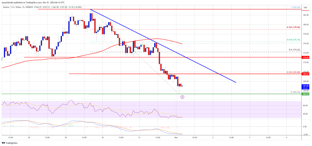 Solana is now trading below $172 and the 100-hourly simple moving average. On the upside, the price is facing resistance near the $170 level. The next major resistance is near the $172 level. There is also a key bearish trend line forming with resistance at $172 on the hourly chart of the SOL/USD pair.