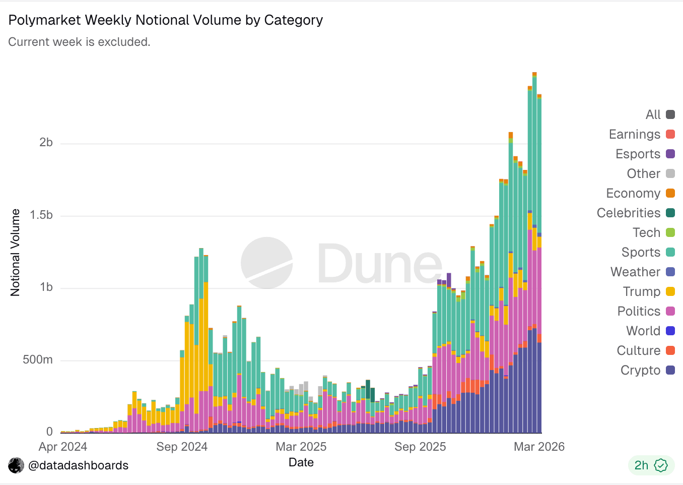 In terms of trading volume, the data dashboard in the image below shows that both the overall weekly trading volume on Polymarket and the cryptocurrency market (the purple bar at the bottom) are continuously growing.