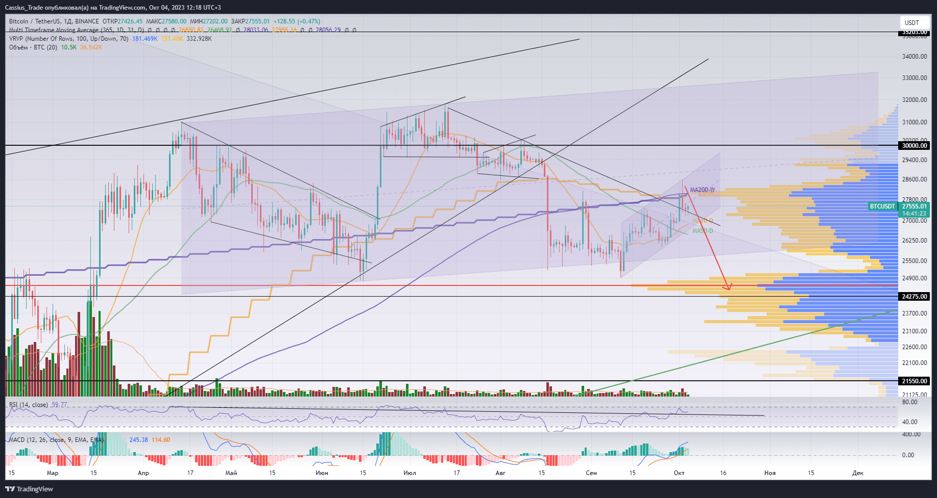 Наполняя прибылью наш шорт, $BTC Биткоин не смог полноценно пробить долгосрочные скользящие средние вверх на дневном таймфрейме. Более того, цена сформировала свечной паттерн Харами, который указывает на слом бычьего локального тренда.