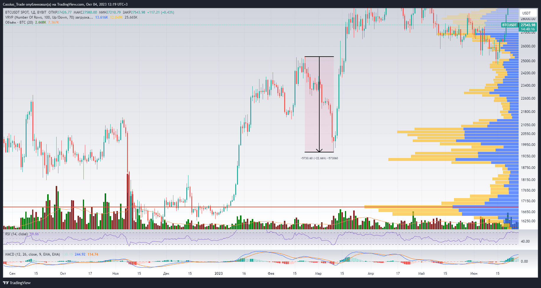 2️⃣ В феврале 2023 года данный индикатор также успешно отработал и в итоге Биткоин упал на -22,6%.