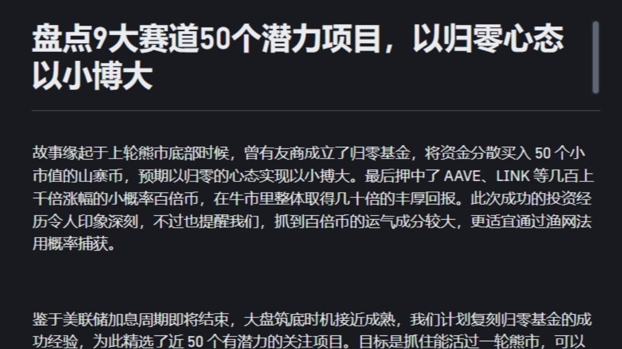 故事缘起于上轮熊市底部时候,曾有友商成立了归零基金,将资金分散买入 50 个小市值的山寨币,预期以归零的心态实现以小搏大。最后押中了 AAVE、LINK 等几百上千倍涨幅的小概率百倍币,在牛市里整体取得几十倍的丰厚回报。此次成功的投资经历令人印象深刻,不过也提醒我们,抓到百倍币的运气成分较大,更适宜通过渔网法用概率捕获。