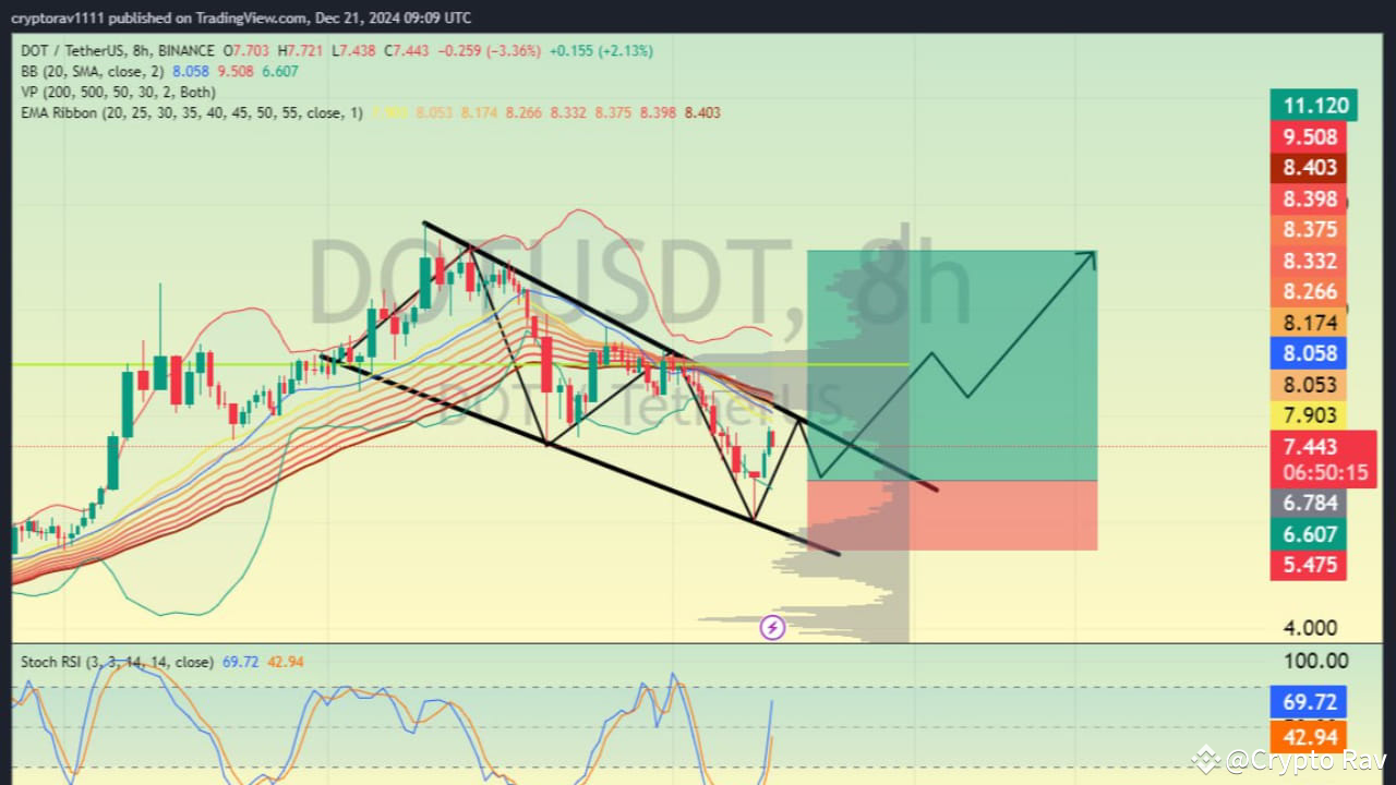 Graficul DOT/USDT pe 8 ore indică o perspectivă bearish pe termen scurt, deoarece prețul rămâne sub rezistența canalului descendent, cu un suport cheie aproape de $6.78. Stochastic RSI la 69.72 semnalează condiții de supracumpărare, indicând o posibilă inversare. RSI la 39.19 reflectă un moment slăbit. Cu toate acestea, panglicile EMA oferă suport dinamic, sugerând o structură bullish pe termen lung. Profilurile de volum evidențiază o acumulare semnificativă aproape de $6.60. Aceasta se aliniază cu perspectiva dumneavoastră: DOT este bearish pe termen scurt, dar are o traiectorie bullish pe termen lung, reflectând sentimentul mai larg al pieței.