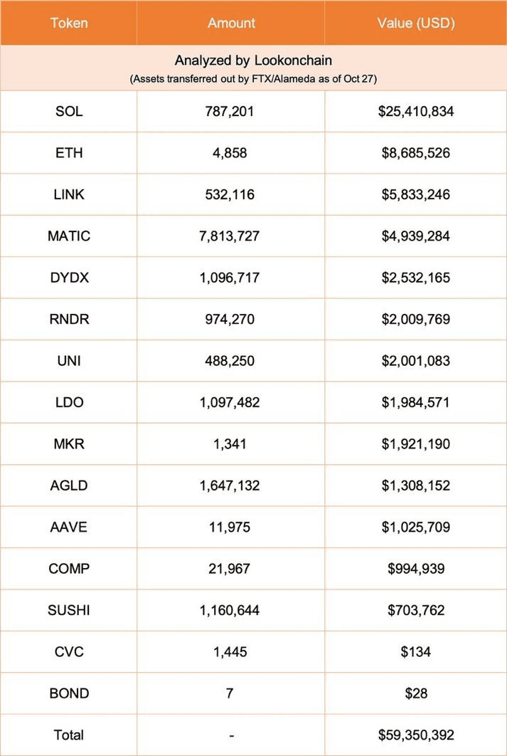 👀 As of Oct 27, FTX / Alameda Research had transferred a total of $59M in crypto assets, including:
