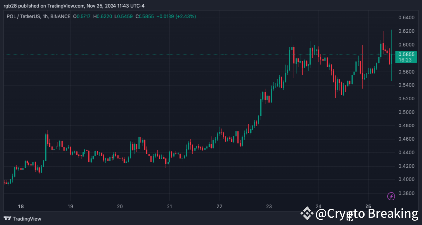 Polygon has seen a remarkable performance over the past three weeks, rising around 107% since the November 5 market pump. POL, previously MATIC, has seen its price move from below the $0.30 mark to a four-month high of $0.61.