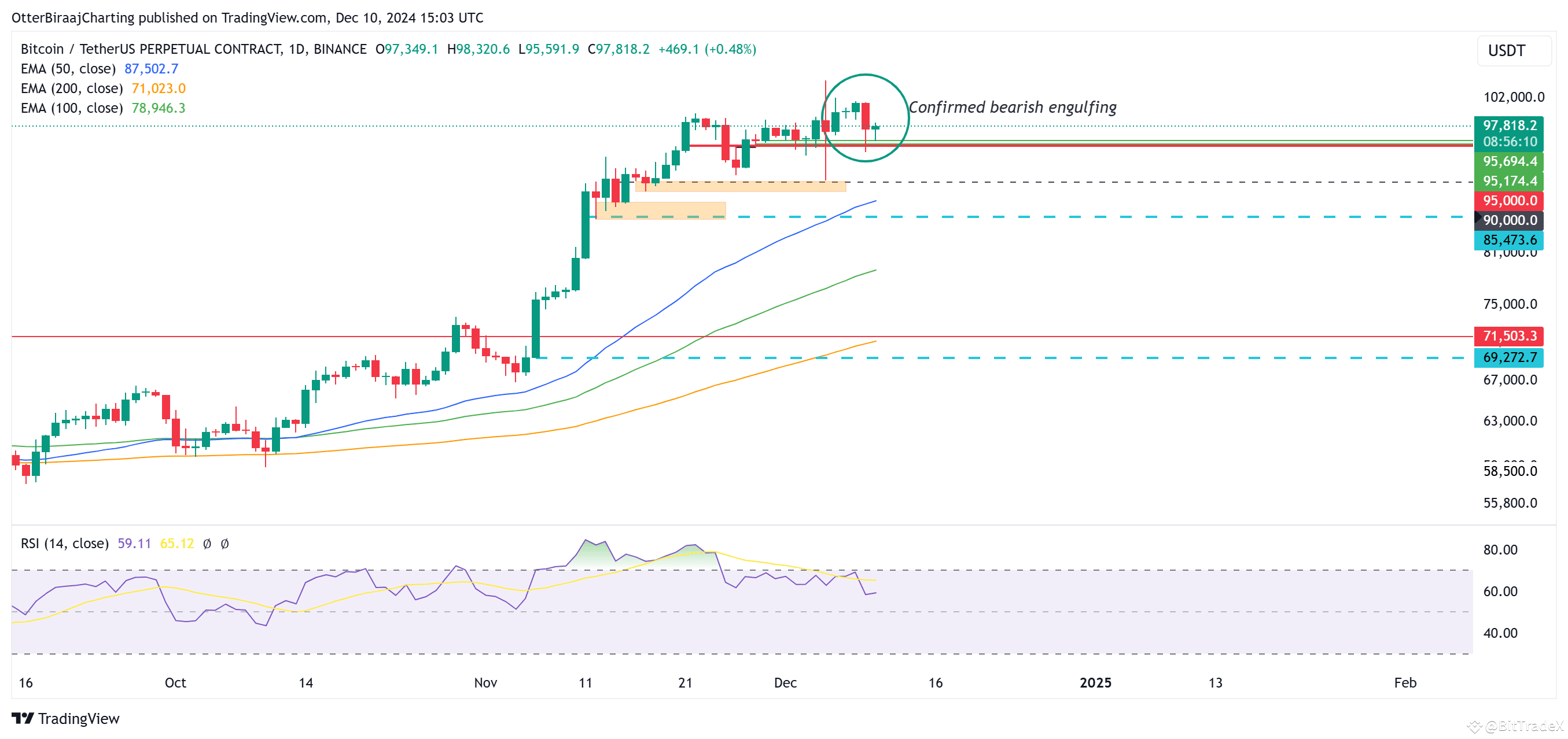 Price exhibited a bearish engulfing pattern on the daily chart for the first time since Oct. 21, retesting its support at $95,000 before descending lower.