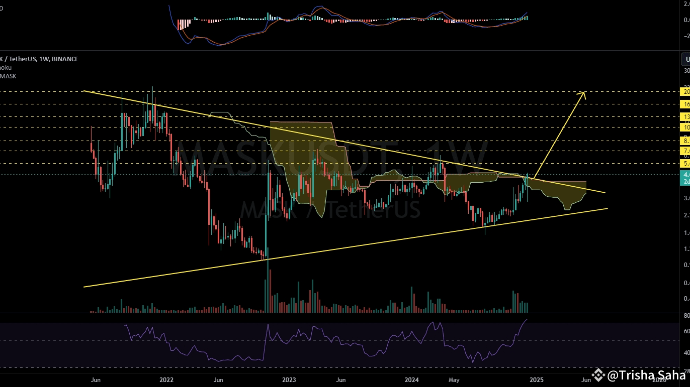 #MASK broken out of the symmetrical triangle and the Ichimoku cloud on the weekly chart. If it manages to stabilize above the pattern, the targets are: