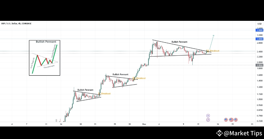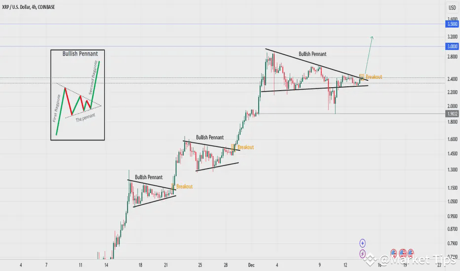 This bullish pennant pattern is not the first occurrence for XRP; in two previous instances, XRP displayed a similar pattern, each followed by an upward breakout. After the breakout, the price experienced a significant rally, establishing the bullish pennant as a consistent technical pattern. This strengthens expectations that XRP may continue its bullish trend if this breakout is confirmed again.