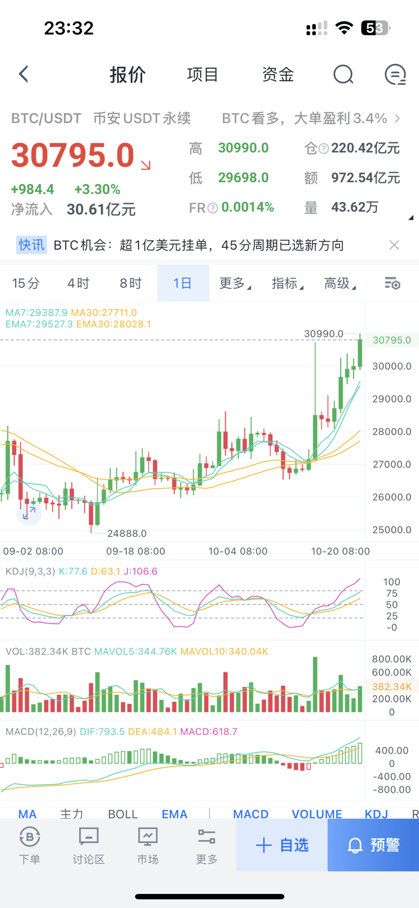 行情再度二轮反幅度上涨,前期有说到短多,持续破位上行,那么当然也得跟着趋势去走。 大饼日内尝试突破31000关口,以太坊已突破1700稍微出现企稳状态,后市行情个人建议还是以高空为主,大饼从底部反抽4000 余点,以太坊进200 点空间,短期以太坊可能补涨尚有空间,大饼就不要去高位追多了。 如有不详可咨询v:btc0298 可获得实盘一对一交流探讨学习。