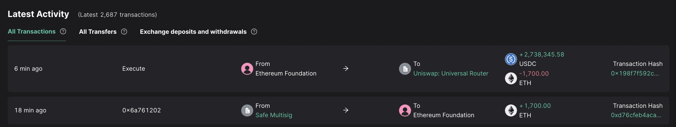 Chẳng hạn, vào tháng 5 năm 2023, Ethereum Foundation đã chuyển tổng cộng 15.000 ETH (tương đương 30 triệu USD vào thời điểm đó) lên sàn giao dịch Kraken. Tương tự, vào tháng 3 năm 2021, Tổ chức đã chuyển 28.000 ETH sang Kraken, dẫn đến giá ETH giảm trong vòng một tuần. Vào tháng 5 cùng năm, việc chuyển 35.000 ETH sang sàn giao dịch đã có tác động tiêu cực ngay lập tức đến giá trị của ETH.
