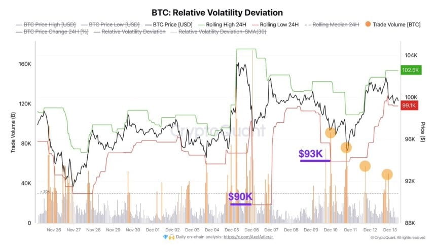 Nhà phân tích hàng đầu Axel Adler gần đây đã chia sẻ những hiểu biết trên X, được hỗ trợ bởi dữ liệu từ CryptoQuant, nhấn mạnh hai mức hỗ trợ quan trọng tại $90,000 và $93,000. Những mức này đại diện cho các khu vực cầu chính, cho thấy rằng đáy thị trường đã chuyển lên cao hơn - một dấu hiệu tích cực của sự kiên cường ngay cả trong bối cảnh không chắc chắn. Theo Adler, những hỗ trợ này có thể hoạt động như các lưới an toàn, hấp thụ áp lực bán nếu Bitcoin không duy trì được động lực trên $100,000.