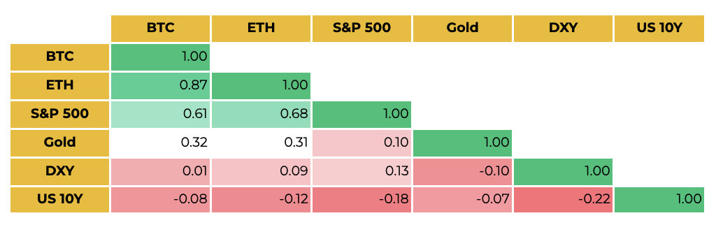 Figure 7: BTC 2M Correlation Matrix (vs ETH, S&P 500, Gold, DXY, US 10Y)