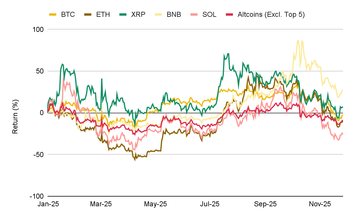 Digital assets recovered this week as selling pressures eased after several weeks of drawdowns, helped by markets shifting toward pricing in a December rate cut. Most assets gained at least 5%, although BTC and several majors (excluding BNB and XRP) remain negative on the year.