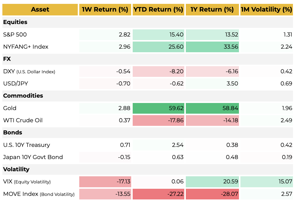 Equities rebounded as sentiment improved and markets priced in higher odds of a Fed rate cut, with both the S&P 500 and the NYFANG+ Index rising near 3%.