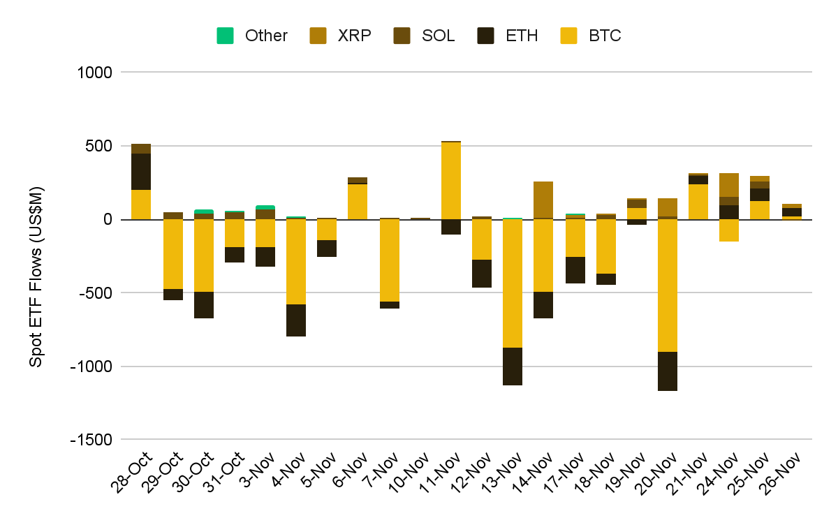 One theme that has remained active in recent weeks is altcoin ETF approvals (including SOL, XRP, LTC, DOGE, among others), many of which have seen consistent net positive flows since launch. It remains early, but with additional altcoin ETFs filed and awaiting approval, this trend is set to reshape altcoin trading by virtue of their extension to TradFi markets. As seen with ETH, the second spot ETF approved after BTC, markets may initially approach these products cautiously as access widens and early demand stabilises, before flows potentially strengthen over time.