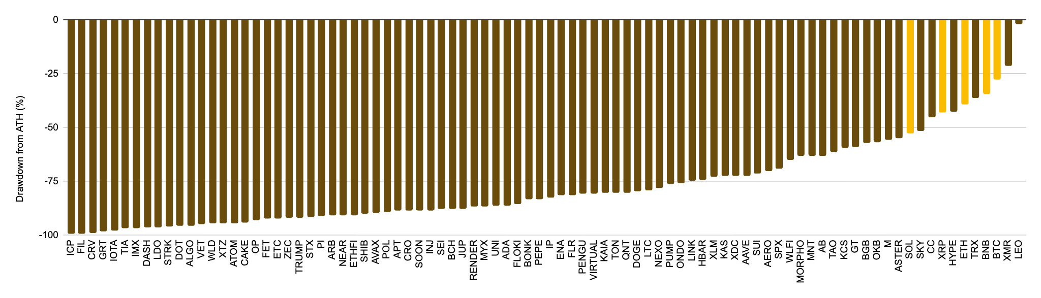 With markets posting a modest recovery this week, it is useful to contextualise where the broader crypto market stands this cycle. A look at the top 100 tokens shows that 79 are still more than 50% below their ATHs, which reflects how narrow this cycle’s rally has been. Despite several majors approaching or hitting new highs earlier in the year, most altcoins have not meaningfully participated.