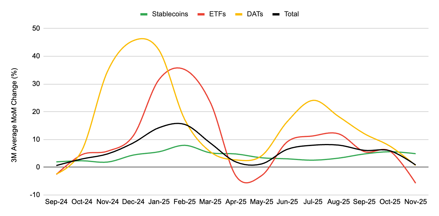 Figure 4: Market liquidity indicators across stablecoins, ETFs, and DATs have softened in recent months