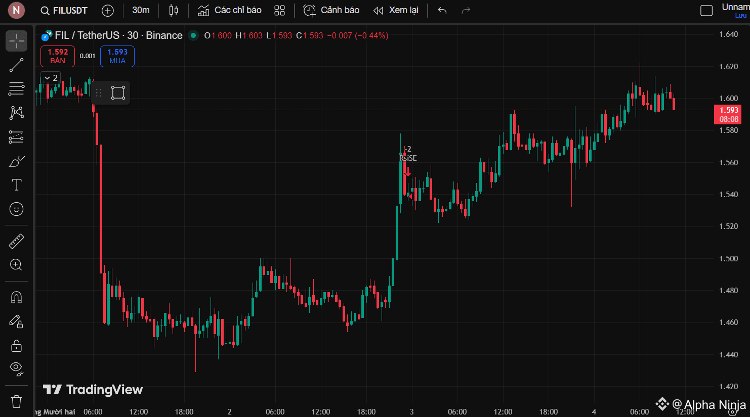FIL giảm mạnh nhưng không thủng đáy và bật lại cực nhanh. Nhịp kéo từ 1.48 lên 1.60 cho thấy tiền thông minh đang hành động. Từ đó đến giờ, mỗi cú nhúng đều bị gom và giá giữ trên 1.56 rất ổn.