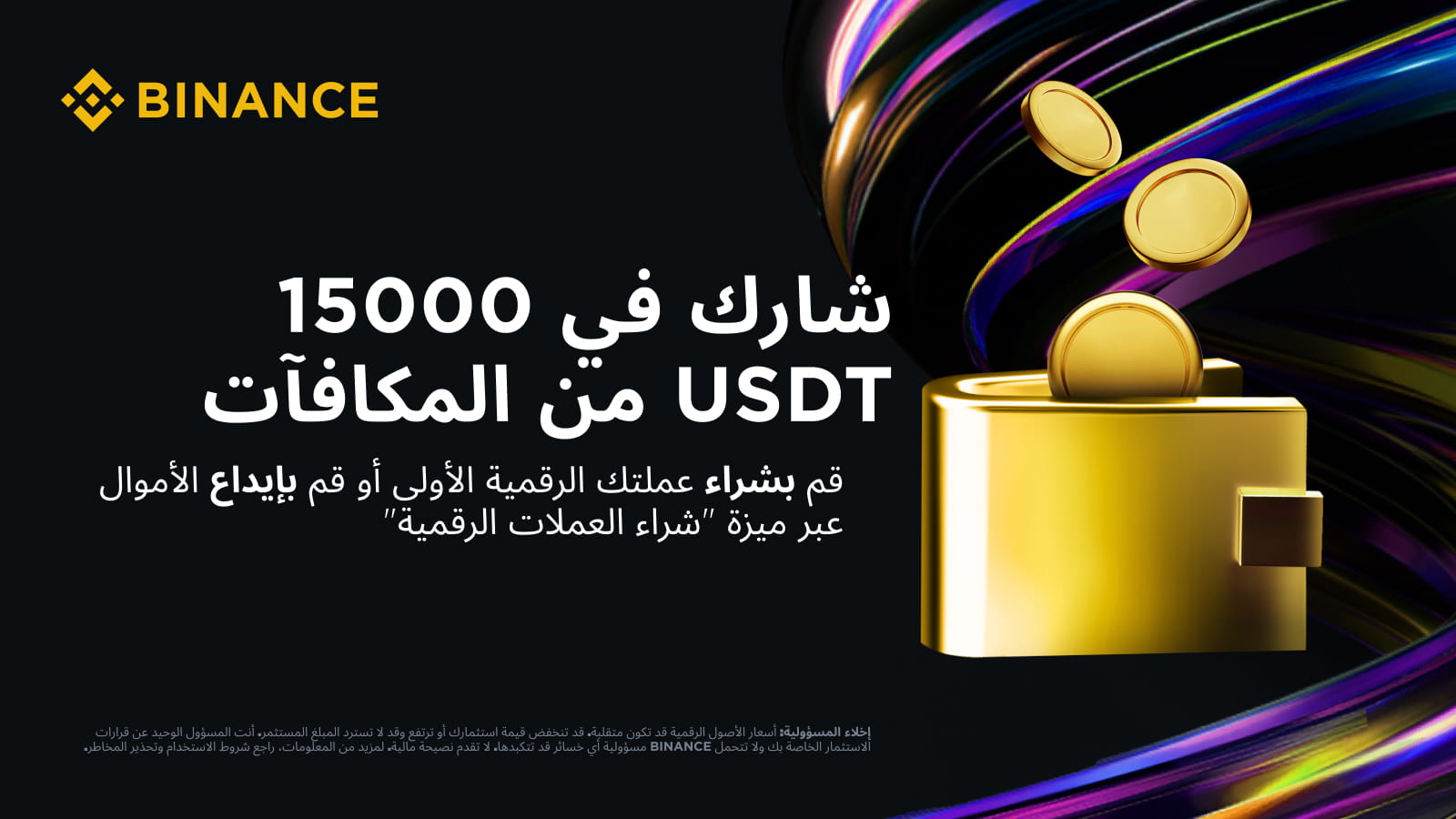 احتفالًا ببطولة Binance (بينانس) العالمية، تقوم منصّة Binance (بينانس) بمنح 15,000 USDT من قسائم الرموز المميزة إجمالًا لمُكافأة المُستخدمين الذين يقومون بشراء العملات الرقمية أو إيداع العملات المحلية المُعتمدة عبر ميّزة "شراء العملات الرقمية" خلال فترة العرض.