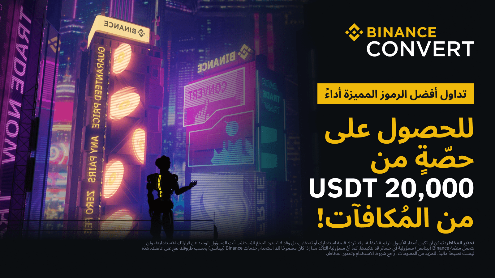يُسر Binance Convert الإعلان عن عرض جديد لمُكافاة مُجتمعنا! خلال فترة العرض، سيتمتّع جميع المُستخدمين الذين يؤكّدون مُشاركتهم ويقومون بتحويل ما لا يقل عمّا يُعادل 1 USDT من أي رمز مميز إلى أفضل الرموز المميزة أداءً على Binance Convert، بفرصةٍ للحصول على حصّةٍ من 20,000 USDT من مُكافآت قسائم الرموز المميزة.