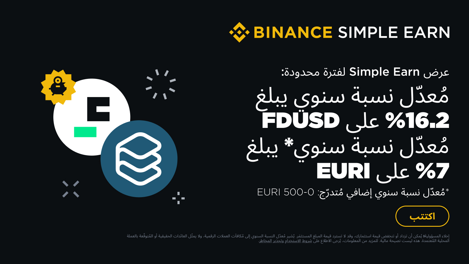 يتم توزيع مُكافآت مُعدّل النسبة السنوي من الأموال الخاصّة بمنصّة Binance (بينانس)، ويتم تحديدها بناءً على تقدير وتقييم ظروف السوق السائدة. هذا العرض غير مُرتبط بمُصدِر رموز FDUSD أو EURI بأي شكل من الأشكال.