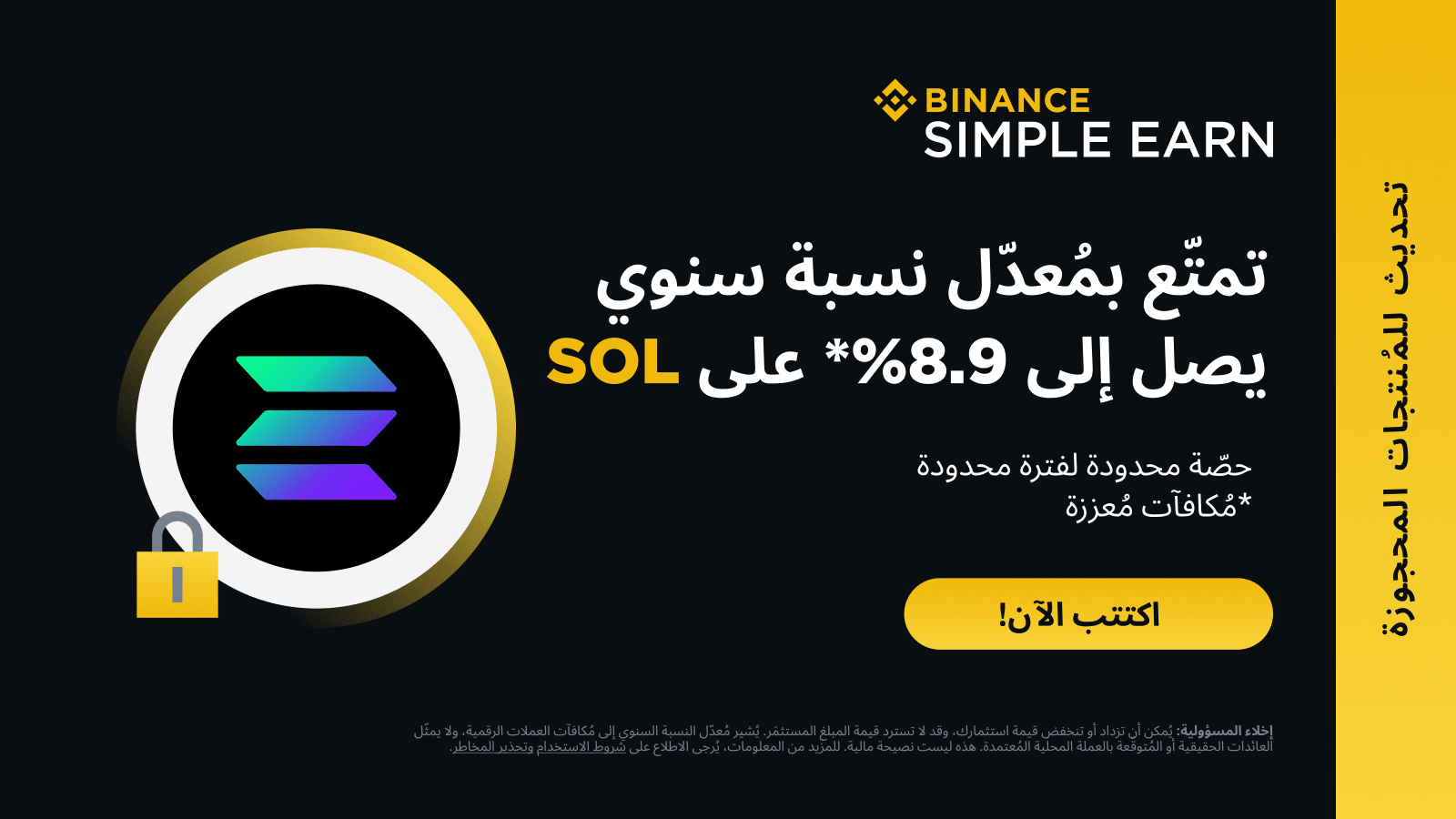يُسر منصّة Binance Simple Earn الإعلان عن تحديث مُنتجات Solana (SOL) المحجوزة. أكمِل عمليات الاكتتاب على مُنتجات Simple Earn المحجوزة لرموز SOL خلال فترة العرض للحصول على مُكافآت مُعدّل نسبة سنوي تصل إلى 8.9%*!