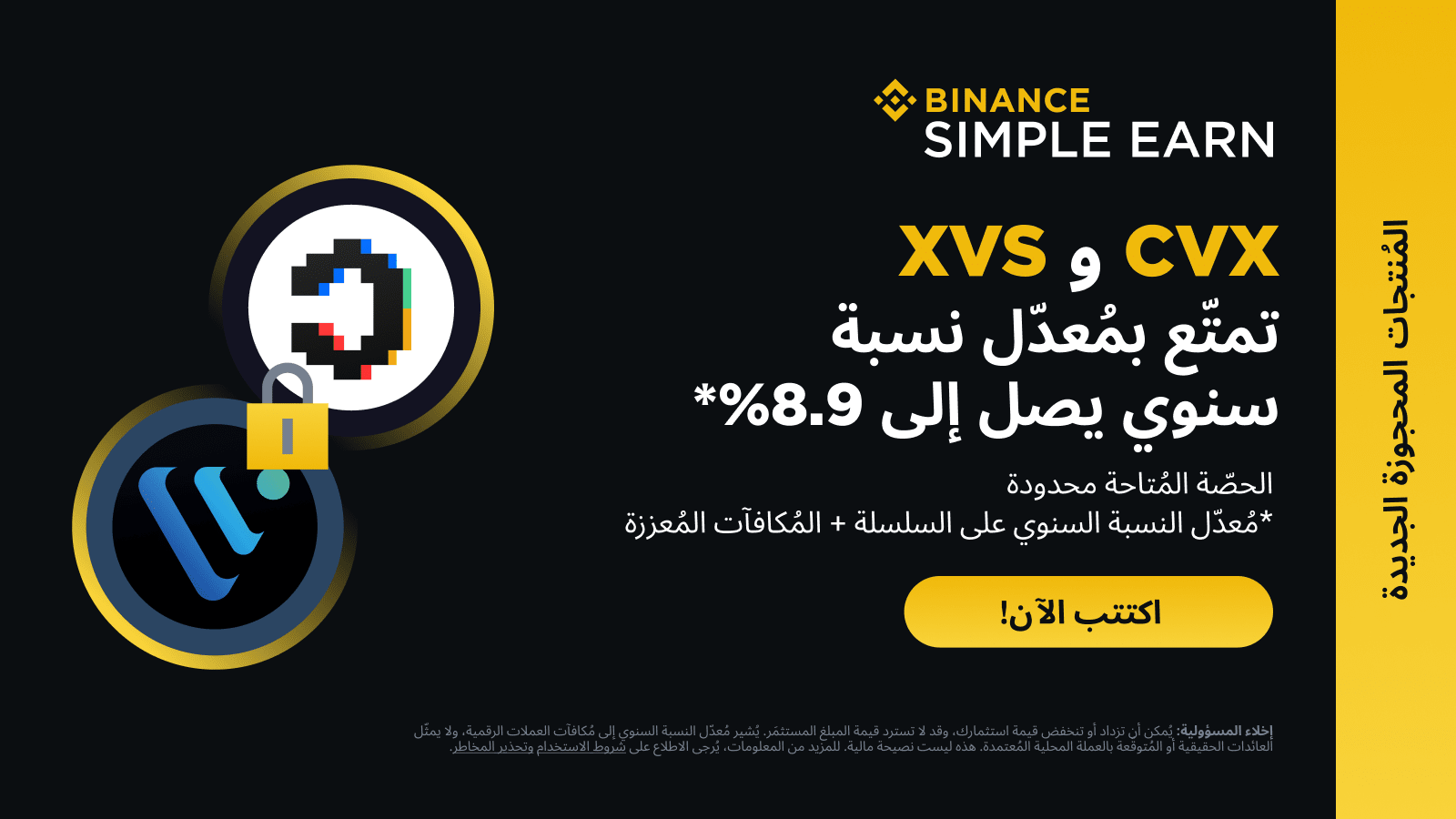 تحذير المخاطر: يمكن أن تتعرض الأصول الرقمية لتقلبات الأسعار. فقد تزداد قيمة استثماراتك أو تنخفض، بل وربما لا تسترد قيمة المبلغ المُستثمر. أنت وحدك المسؤول عن قراراتك الاستثمارية و Binance (بينانس) ليست مسؤولة عن أي خسائر قد تتكبدها. مُعدّل النسبة السنوي هو قيمة تقديرية للمُكافآت التي ستربحها من العملات الرقمية خلال الإطار الزمني المُحدد، وهو لا يعرض العائد/الأرباح الحقيقية أو المُتوقّعة بأي عملة محلية مُعتمدة. كما يتم تعديل معدل النسبة السنوي يوميًا وقد تختلف المكافآت المُقدرة عن المكافآت الفعلية المُحققة. هذه ليست نصيحة مالية. للمزيد من المعلومات، يُرجى الاطلاع على شروط الاستخدام الخاصة بنا وتحذير المخاطر.