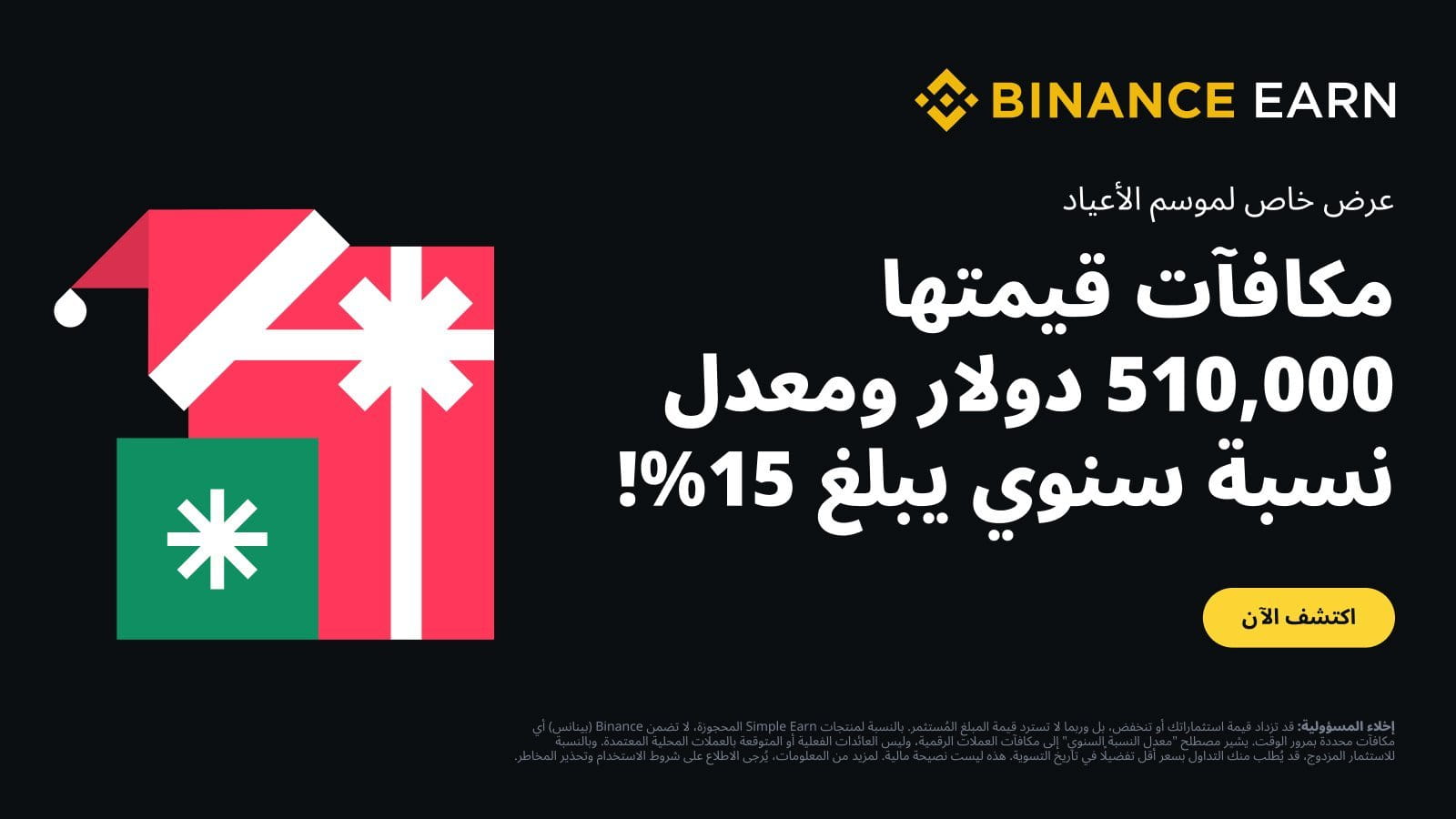 في إطار تقويم عيد الميلاد خلال موسم #BinanceSeason هذا، يُسر منصّة Binance Earn أن تُطلق ثلاثة عروض على مُنتجات Simple Earn المحجوزة وتخزين SOL والاستثمار المُزدوج. من خلال المُشاركة في هذه العروض، يُمكن للمُستخدمين المؤهلين الحصول على حصّةٍ من 510,000$ من المُكافآت والتمتّع بمُعدّل نسبة سنوي يصل إلى 15%.