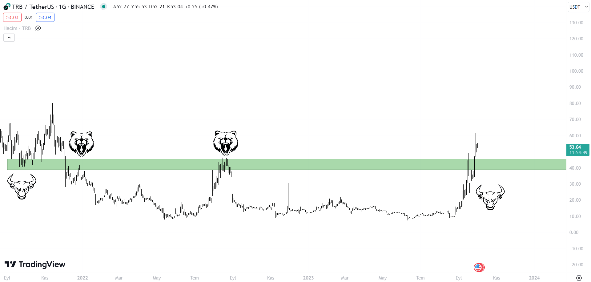 Teknik analizde kırılan bir direncin desteğe, kırılan bir desteğin de dirence dönme ihtimalinin yüksek olduğu kanısı vardır. Bu doğrultuda daha önce defalarca çalışıp fiyatın yönünü tayin eden 38-45 $ lokasyonunun TRB için ciddi bir destek olma ihtimali söz konusudur.