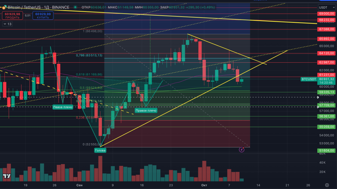 Все это намекает, что снижение только началось. Минимальная цель прежняя и она совсем рядом - это объемный уровень 59 335$ и уровень 0.5 по Фибоначчи сентябрьского роста (курс 59 524$). На пути к ним - EMA 200 дневного ТФ, на сейчас в районе психологического уровня 60 000$.