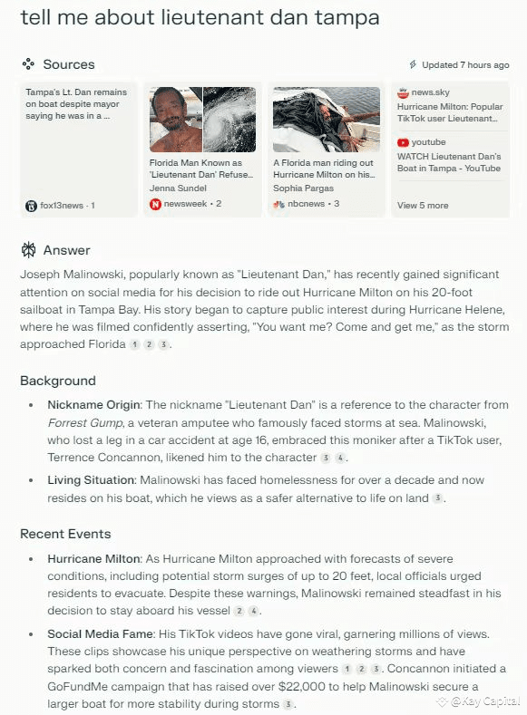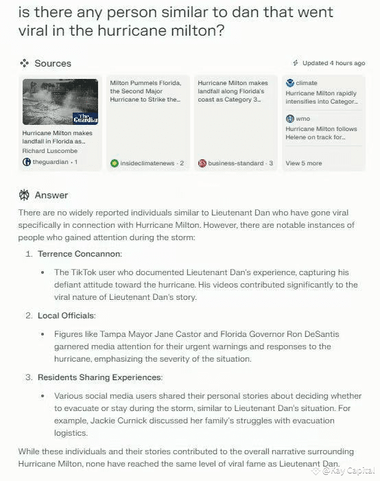 我简单搜索推特了解到$Dan是一个名人币,dan是最近美国受台风Milton影响,坚持守在他自己船上不走,后来被挖出来经历过很多苦难的一个当地居民,他的坚韧和乐观某种程度上让很多人产生了共鸣(这是背景)。所以你如果错过了$Dan,你又知道大家的注意力都聚焦在这场台风上,某种程度上是“新闻交易”,你该做的是赶紧去挖掘围绕dan或者这场台风的衍生机会,而不是感叹“操,又错过了”。怎么找呢?分享一下perplexity.ai,它是一个免费且有实时新闻的AI Agent,并会在反馈你的信息里标明它的信息来源,它也是基于gpt大模型的(我身边做AI的朋友们日常用gpt做信息搜集的几乎没有了,只在某些强逻辑场景用gpt 4o1,比如帮你看合约代码,大家做日常信息搜集基本都用perplexity)。我来简单演示一下,希望大家可以自己也去动手试试看: