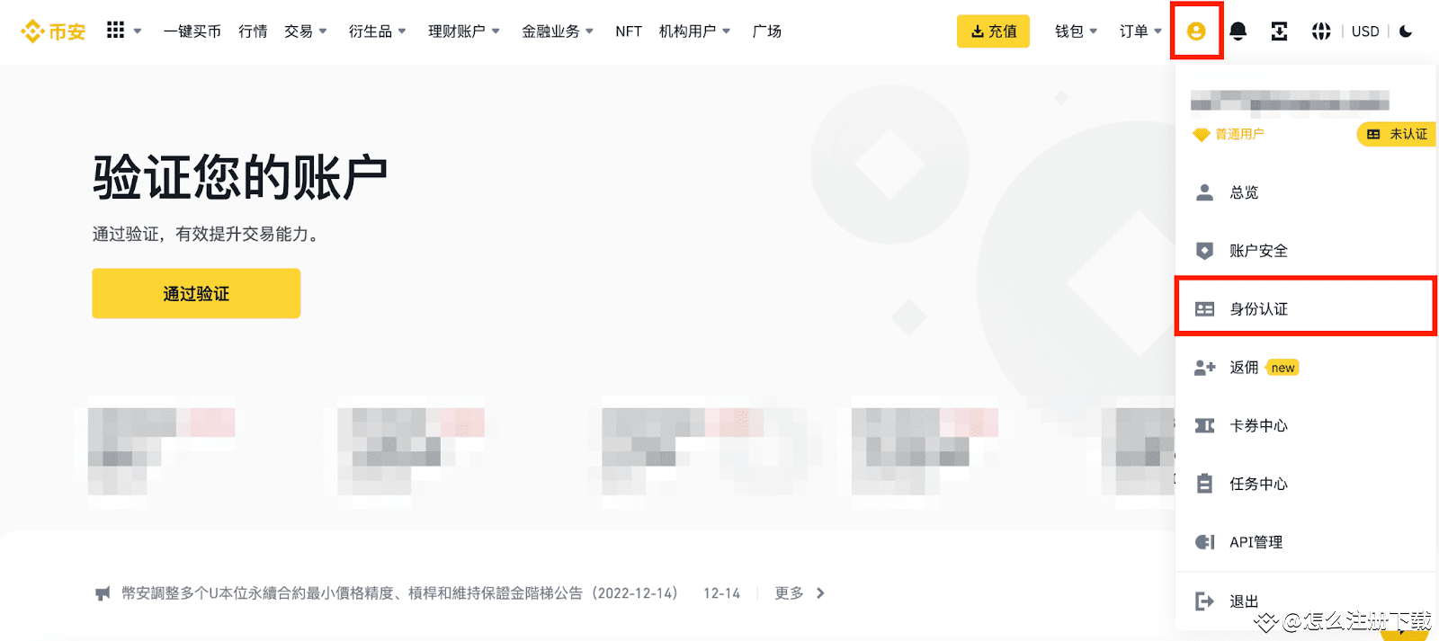 1. 登录币安账户,点击【用户中心】 - 【身份认证】。