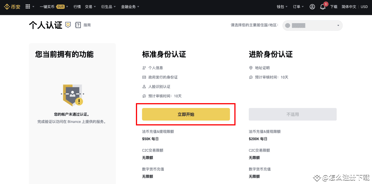 在这里,您可以看到相应的认证等级:标准身份认证、进阶身份认证和企业认证。不同国家或地区的限额各不相同。点击【主要居住国/地区】旁边的按钮,可以选择您的居住国或地区。