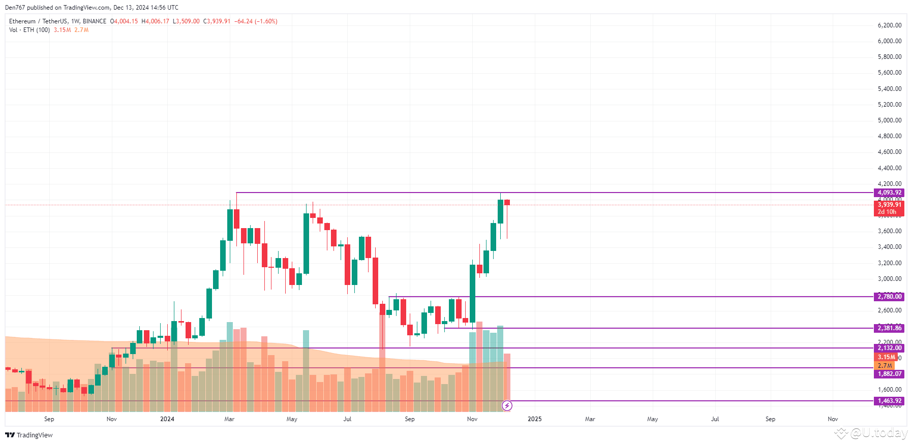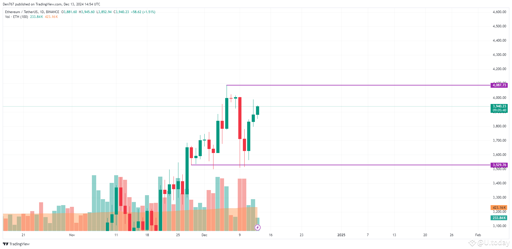 A bullish picture can be seen on the weekly chart. If the candle closes around the $4,093 level, the accumulated energy might be enough for a blast to the $4,400 zone.