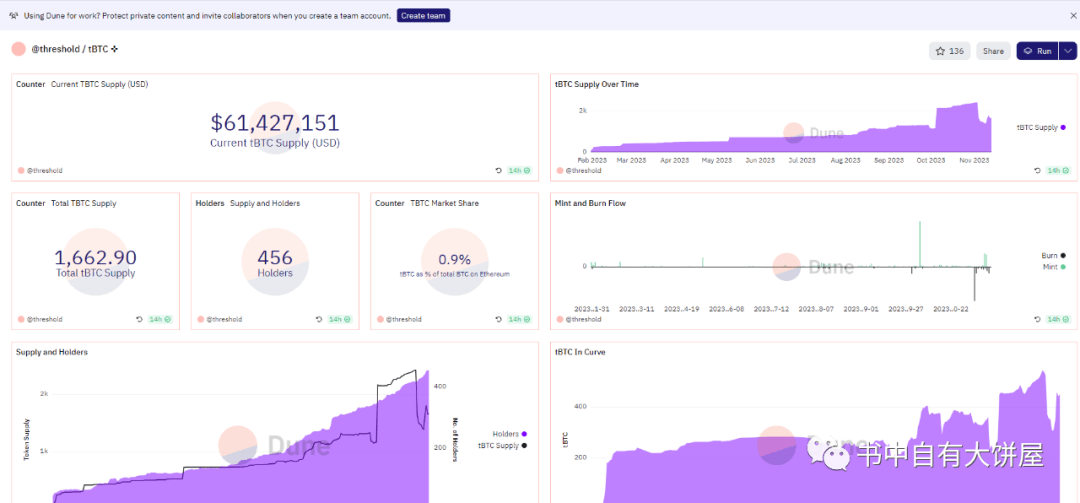 最后总结下这个项目,这是比特币生态的一个项目把,把比特币跨链到以太坊上,因为比特币链上没有智能合约,没有应用,所以很多人手里的大饼特别是屯币的,就只能呆呆的放在钱包里,有了这个跨链,就可以提高比特币的流动性,比如跨到以太坊上质押,借出来U可以再去投资,可以产生一定的杠杆,是肯定有这个需求的,从老大WBTC的体量上就能看出,一直在增长,体量也到了57亿美金,而这个项目目前链上的比特币和WBTC还是有很大的一个差距,一个数量级上的差距,其实就赢在它提前发币了,而WBTC没有发币,其实从TVL和市值对比上,T项目市值2.3亿美金来看,有点过高了,这波也是被比特币暴涨带动的,然后还有个问题就是这个协议光从收入上其实挺难赚钱的,它的这个赚钱逻辑和Tether公司一样,就是我拿了btc过来质押,然后你在以太坊链上给我一个TBTC,其实这个Tbtc也是你自己发行的,是没有成本的,而你拿了我真实的btc是有价值的,但是目前TBTC的锁定是没有链上记录的,也就是说你可以拿着我的btc去干其他事情,而用户不知道,所以这个套路和银行是一样的,虽然tether公司也没有透明的审核,但是这里面确实是有这个风险存在。至于这个代币的攻略还是在星球种说明。