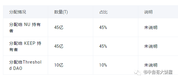 Threshold为隐私、访问控制和x-chain桥提供了一套密码学构建模块:代理重新加密(PRE), Threshold 签名(TSS),分布式密钥生成(DKG),随机信标(RB)。Threshold Network(T)代币由NuCypher(NU)与Keep Network(KEEP)代币合并转换而来,并按照 1 NU = 3.26 T、1 KEEP = 4.78 T 的兑换比例来发放代币T。