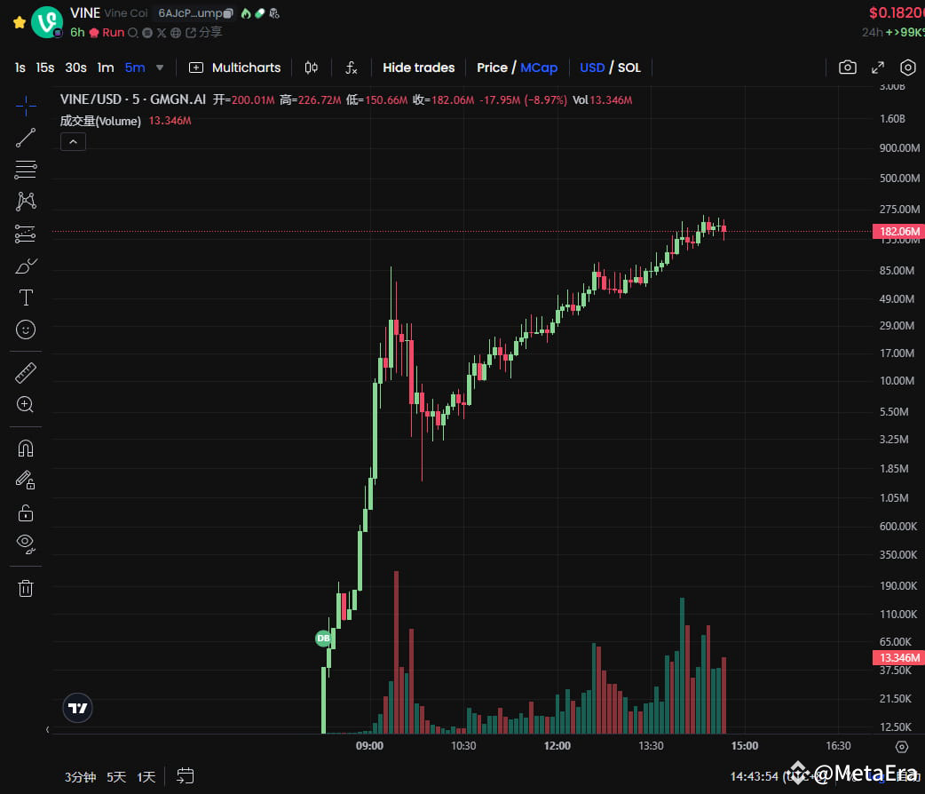 2025 年 1 月 23 日,Rus 在 X 平台高调宣布推出 VINECOIN,并附上一段自拍视频:“账号未被盗用,这是 Vine 的新生。”代币上线仅 3 小时,市值便突破 4200 万美元,成交额飙升至 1.8 亿美元,截至发文,VINECOIN 市值已经突破 2 亿美元。