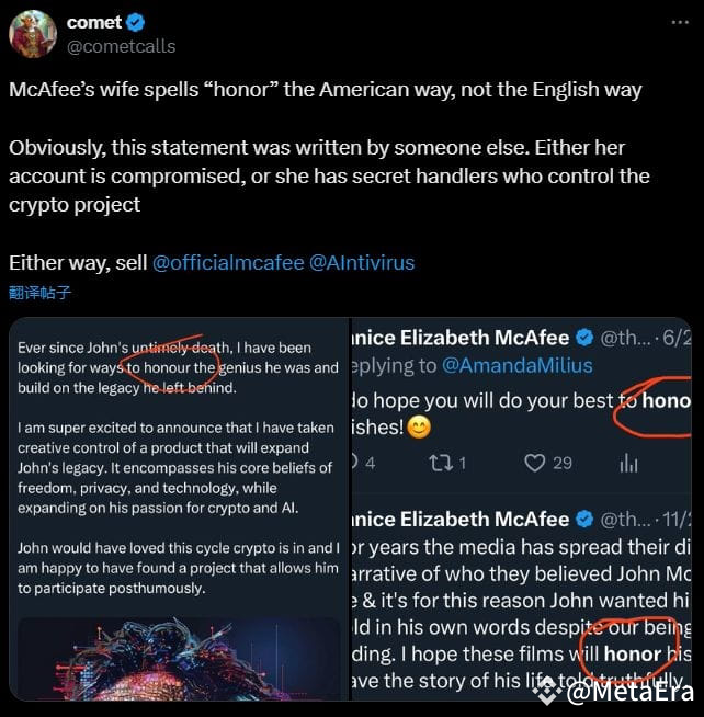 加密社区用户@cometcalls 发现,Janice 的推文中“honor”采用了美式拼写(而非英式拼写“honour”),与其过往推文习惯不符。这一细节引发猜测:“要么她的账号被入侵,要么幕后有团队操控代币项目。”