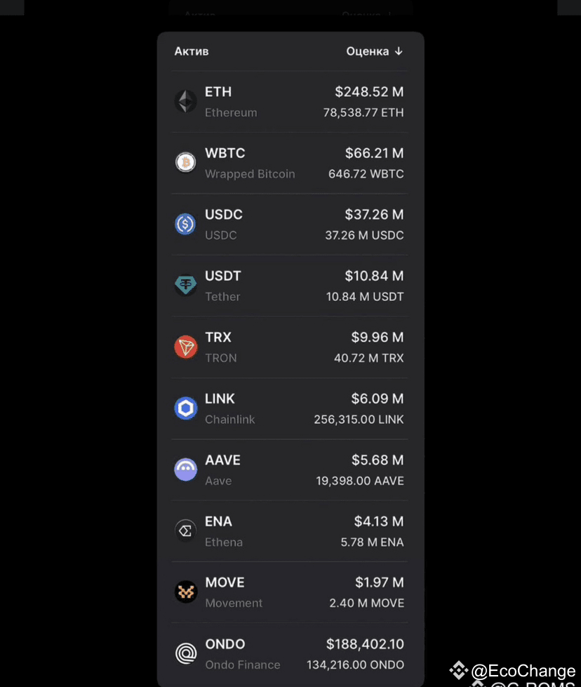 Главным активом является ETH, далее идут такие криптовалюты, как: TRX ($10 млн), LINK ($6,2 млн), AAVE ($6 млн), ENA ($4,2 млн), а также значительная часть, $47,4 млн, находится в стейблкоинах.