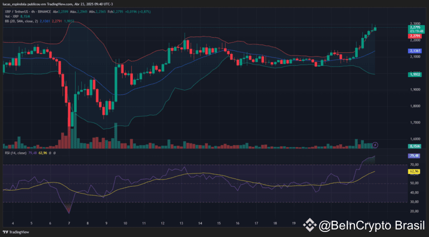 O Índice de Força Relativa (RSI), que mede o momento do ativo, alcançou 79,48, um patamar considerado sobrecomprado, acima dos 70 pontos. Esse nível normalmente sugere que o ativo pode estar com seu preço esticado e, portanto, suscetível a uma correção ou realização de lucros nos próximos candles. Ainda assim, o XRP demonstra força compradora considerável, sustentada pelo volume crescente.