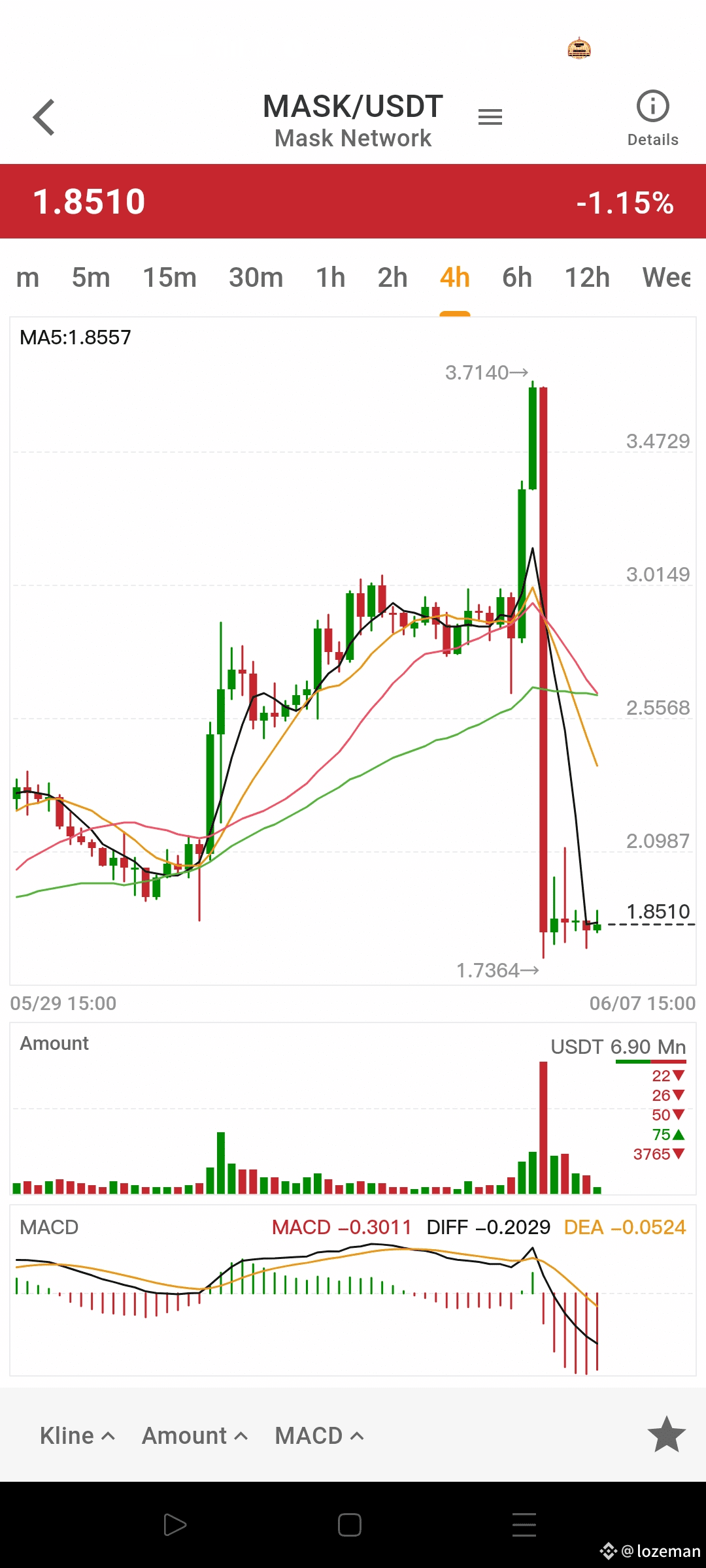 - حجم التداول: 6.90 مليون USDT، مع وجود سيولة مرتفعة عند مستويات معينة (مثل 3765▼).