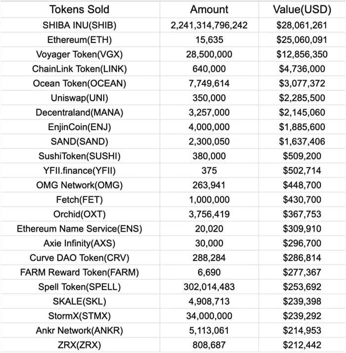 链上调查员补充说,自 2 月 14 日以来,Voyager 一直在向加密交易所发送不同的加密资产。其中一些资产包括Ethereum、Shiba Inu、SushiSwap、Chainlink等。这些资产累计价值超过 1 亿美元。