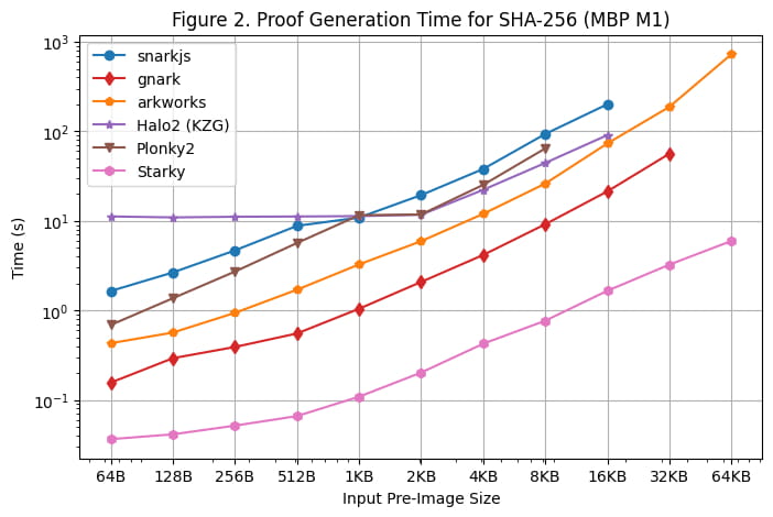 [Figure 1] illustrates the proof generation time of each framework for SHA-256 over the various pre-image sizes, using the Linux Server. We are able to make the following observations: