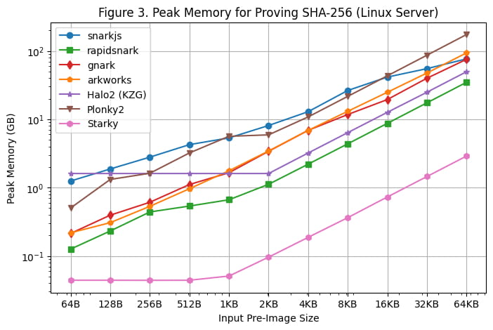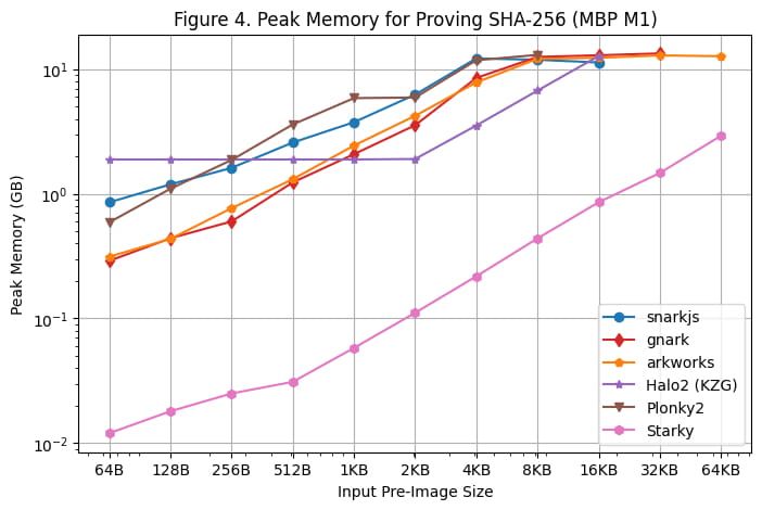 Except for Starky, all SNARK frameworks encountered out-of-memory (OOM) errors or used swap memory (resulting in slower proving time) when the pre-image size became large. Specifically, Groth16 frameworks (snarkjs, gnark, Arkworks) began to use swap memory when the pre-image size was greater than or equal to 8KB, and gnark encountered OOM for 64KB. Halo2 encountered a memory limit when the pre-image size was greater than or equal to 32KB. Plonky2 begins to use swap memory when pre-image size was greater than or equal to 8KB.