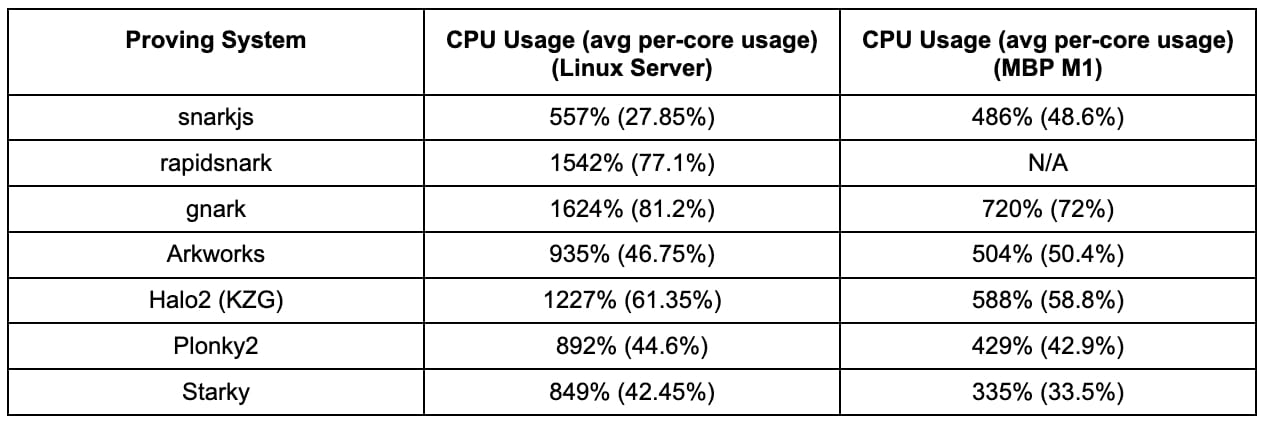 We evaluated the degree of parallelization for each proving system by measuring the average CPU utilization during proof generation for SHA-256 over a 4KB pre-image input.. The table below shows the average CPU utilization (and the average utilization per core in the parentheses) on both the Linux Server (with 20 cores) and the Macbook M1 Pro (with 10 cores).