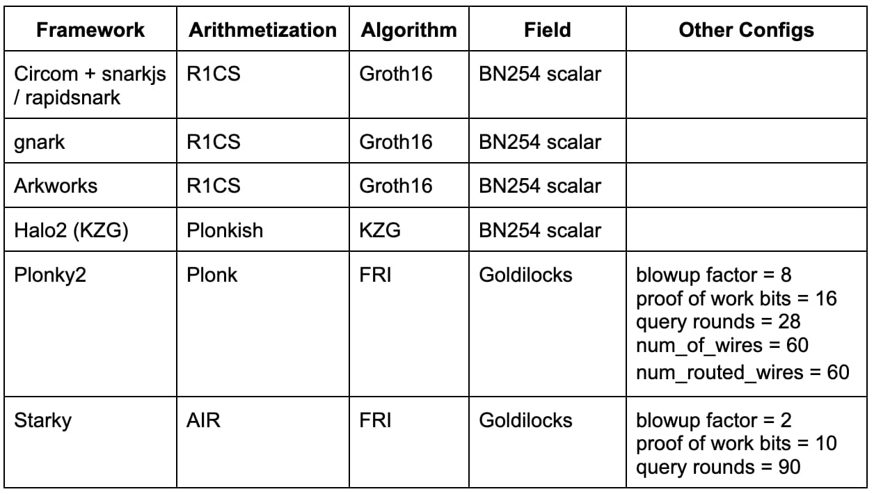 The table below summarizes the above frameworks with the relevant configurations used in our benchmarking. This list is by no means exhaustive and many state-of-the-art frameworks/techniques (e.g., Nova, GKR, Hyperplonk) are left for future work.