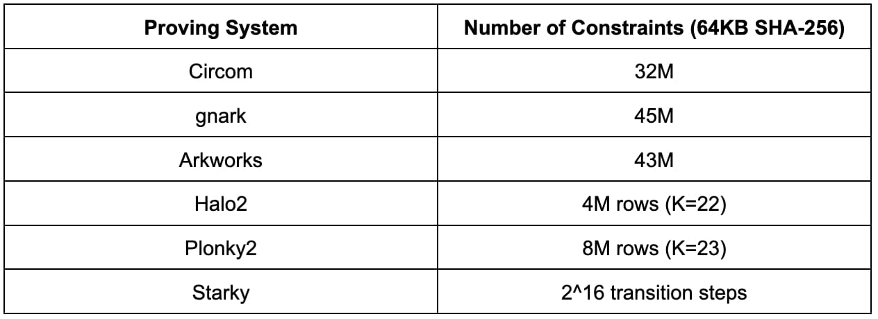 Before we move on to the detailed benchmarking results, it’s useful to first understand the complexity of the SHA-256 by looking at the number of constraints in each proving system. It is important to be aware that the constraint numbers in different arithmetization schemes are not directly comparable.