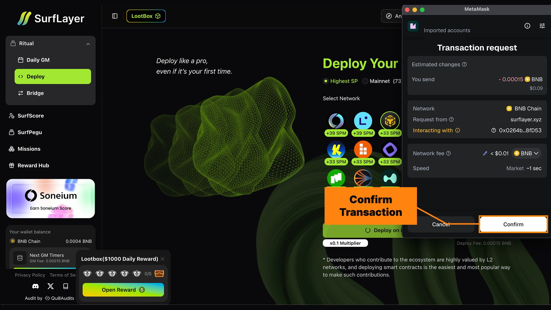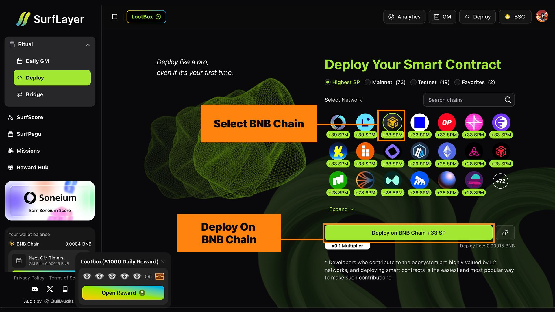 For users who want to go beyond simple transfers and start building a verifiable on-chain identity, SurfLayer provides a simple and efficient way to deploy smart contracts on BNB Chain with just a few clicks.